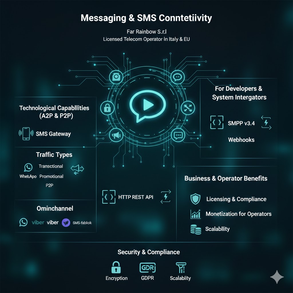 Far Rainbow S.r.l. bietet globale Messaging-Dienste unter der Marke Stertell an. Als lizenzierter Telekommunikationsbetreiber in Italien (ROC & BEREC Nr. 44178) und der Europäischen Union gewährleisten wir direkten Zugang zu Mobilfunknetzen in voller Übereinstimmung mit den regulatorischen Anforderungen (DSGVO und lokale Telekommunikationsgesetze).