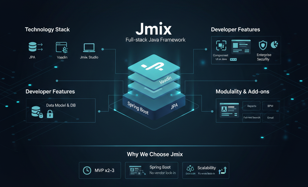 Tooling: Jmix Studio (an IntelliJ IDEA plugin) for visual data and UI modeling.